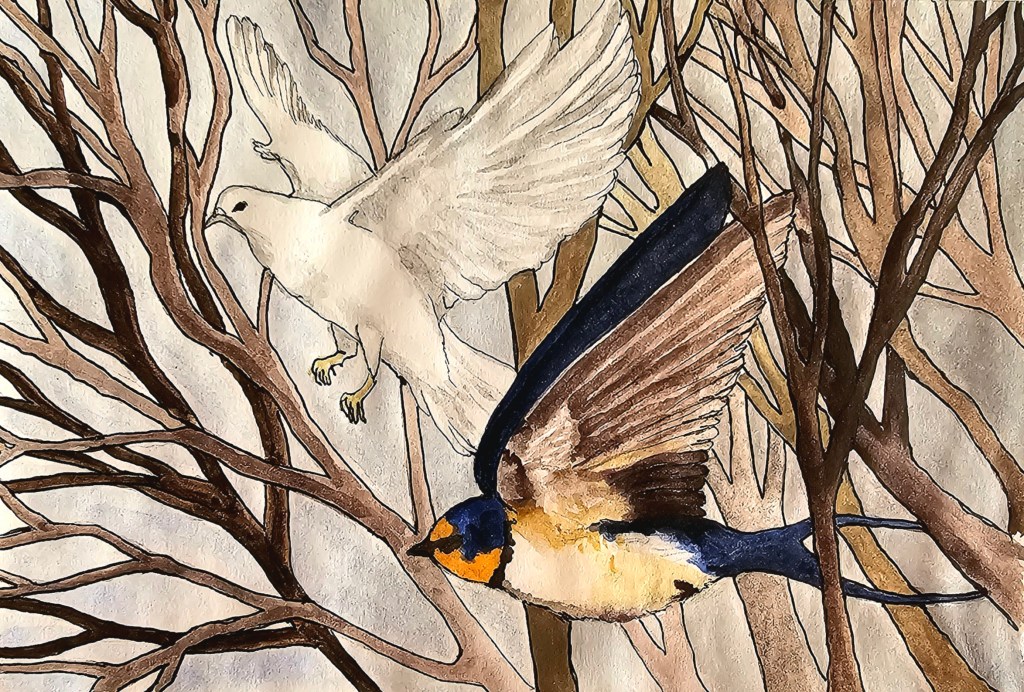 As time went on, that vision changed in my mind. The swallow wasn’t flying alone anymore but being led by a dove. I painted it one day to remind myself that I don’t struggle alone, and there is always a way through our trials with God.
